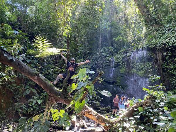 Hiking at Hacienda Ébano, a Costa Rican Natural Reserve and Ranch. The customer will experience a 1km / 0.6-mile short hike or a 2.5km / 1.6 miles medium hike through the rainforest, 2 gorgeous waterfalls with natural pools, where is possible to swim, also stunning mountain views.